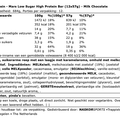 Ongeveer 200–201 kcal per reep — relatief laag voor een chocoladereep met extra eiwit.